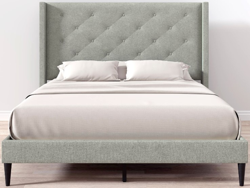 Elevate your bedroom space with this Carrington Upholstered Bed. The button-tufted design and wingback construction of the headboard go with any decor. The platform bed includes a headboard, footboard, and side rails, all in one box.Read More
