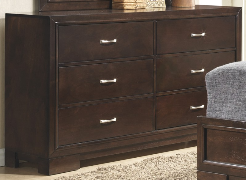 This collection of bedroom pieces can be adapted to fit into any bedroom in your home. It features unique storage options, framed panels, and block feet. Chrome colored hardware adorns drawer faces and pops against the deep brown finish of the walnut veneers.Read More