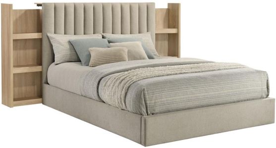 A striking balance of softness and ingenuity, this storage bed is a true centerpiece. A plush, vertical channel-tufted headboard is embraced by light oak bookcase panels, each with three open shelves that glide outward on hidden casters.Read More