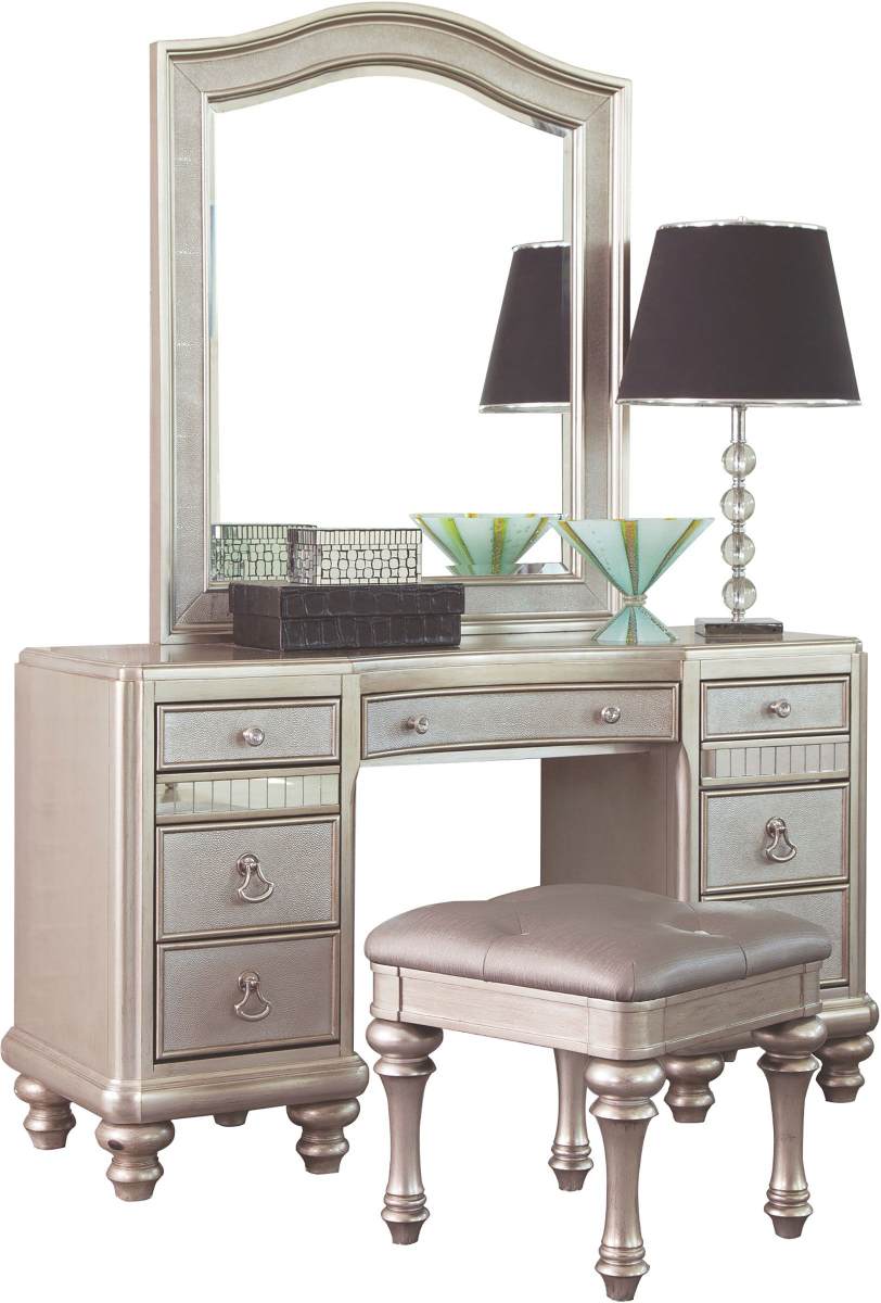 Feel like you’re sitting on a throne when you take seat at this exceptional vanity set. The exceptional metallic platinum finish boasts plenty of character along with the textured drawer panels with mirrored accents. The curved tabletop mimics the gorgeous camel top mirror.Read More