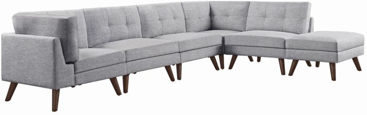 Long workdays become a bit more bearable when you can sink into this stylish and comfortable mid-century modern sectional. This is a six-piece grey sectional with an exceptionally tailored appearance, constructed with clean lines and supported on rounded tapered legs.Read More