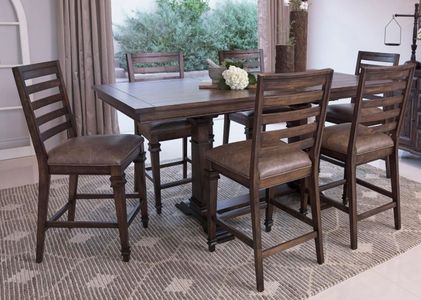 Lend a rustic vibe to a contemporary home with this five-piece counter height dining set, in a vintage dark pine wood finish. Beautiful and charming, the table offers a plank style tabletop that rests on a tall trestle base with accent molding and bracket feet.Read More