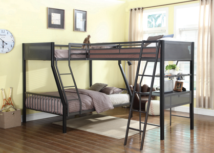 This twin over full bunk bed is finished in black and gunmetal for versatile appeal.