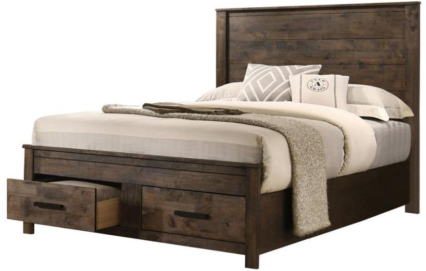 This bed features an imposing headboard and storage footboard in a platform design. The full matte rustic golden brown finish includes beautiful wire brushed wood grain details for a cozy countryside allure.Read More