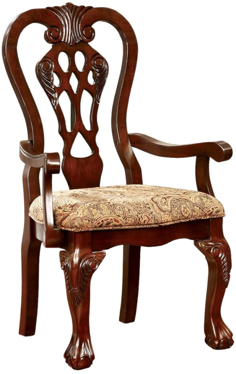 Classic elements are at the forefront with this brown cherry finished collection. The intricately designed chair backs match beautifully with the meticulously carved table, while the padded fabric seat cushions offer both comfort and style.Read More
