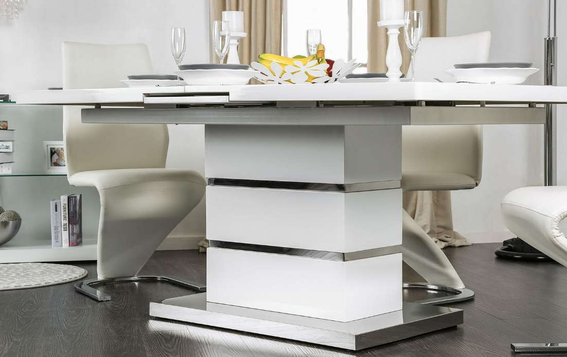 The sophisticated appeal of this modern set will upgrade your average family dinner to a fabulous fine dining experience. Coated in a high gloss lacquer finish, the easily expandable table sits atop a two-tone base accented with chrome trim accents. Matching padded leatherette chairs flaunt a smooth Z-shaped modern base.