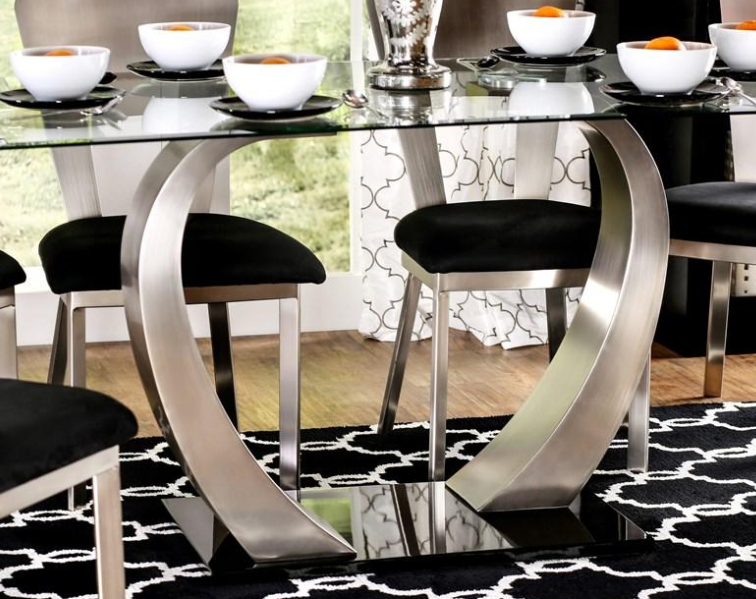 Graceful curves durably support the wide, rectangular glass top. The elliptical metal posts feature beautiful satin plated powder coating, matching the metal chair frames. Relax in style as the padded microfiber cushions offer comfort while the black upholstery complements the black finished base.