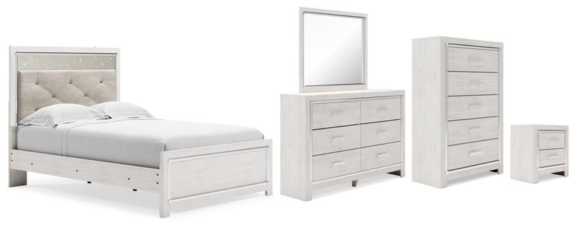 Includes full panel bed (headboard, footboard and rails), 6-drawer dresser with mirror, 5-drawer chest, and 2-drawer nightstand