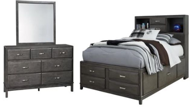 Includes storage headboard, storage footboard, side rails with storage, roll slats and dresser with mirror