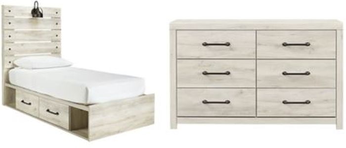 Includes panel storage bed (headboard, footboard, side storage, rails and slats) and dresser