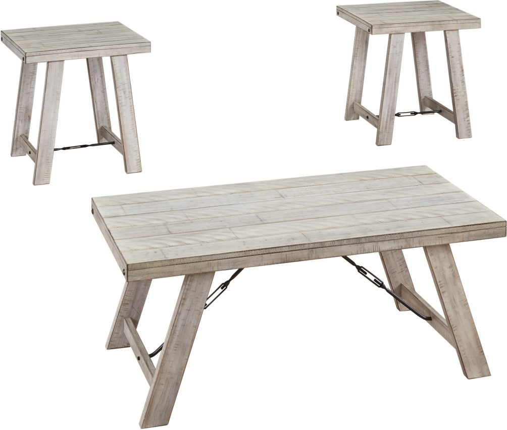 A rustic rendition of modern farmhouse style, this coffee table set is right in tune with your richly relaxed sense of style. The clean yet hearty profile is enhanced with a distressed whitewash finish and offset plank-effect tabletop. Decorative tension bar and nailhead accents add an industrial twist.Read More