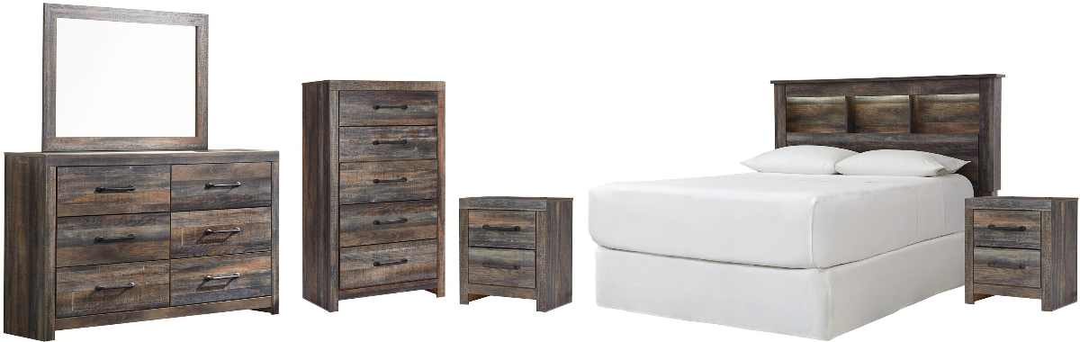 Includes bookshelf headboard, 6-drawer dresser with mirror, 5-drawer chest and two 2-drawer nightstands
