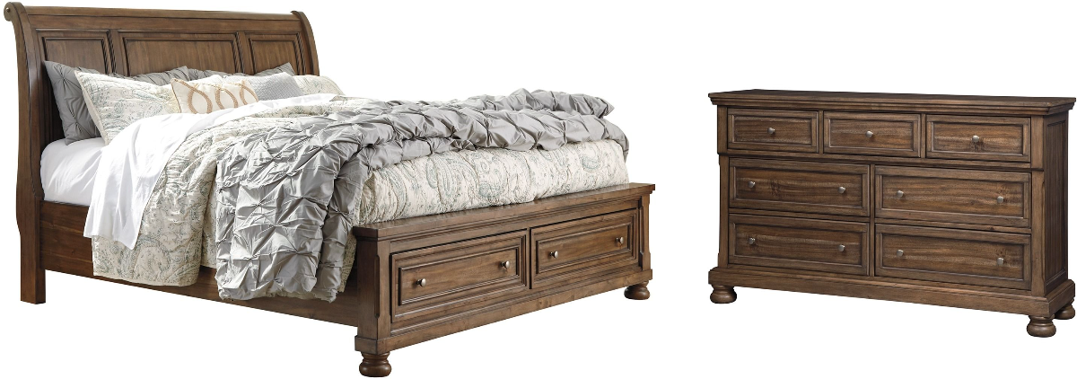 Includes headboard, storage footboard, rails and dresser