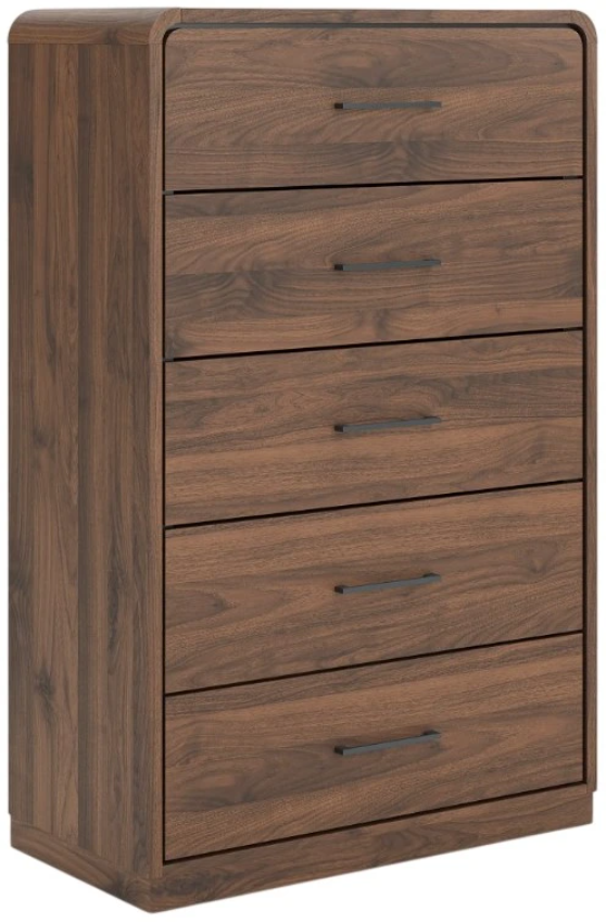 Grace your restful retreat with an added dose of refinement. This chest of drawers showcases a stunning rich brown wood tone, with sleek drawer pulls for an added layer of luxury. A rounded top softens the silhouette, elevating the look. It’s curated, contemporary and utterly chic.Read More