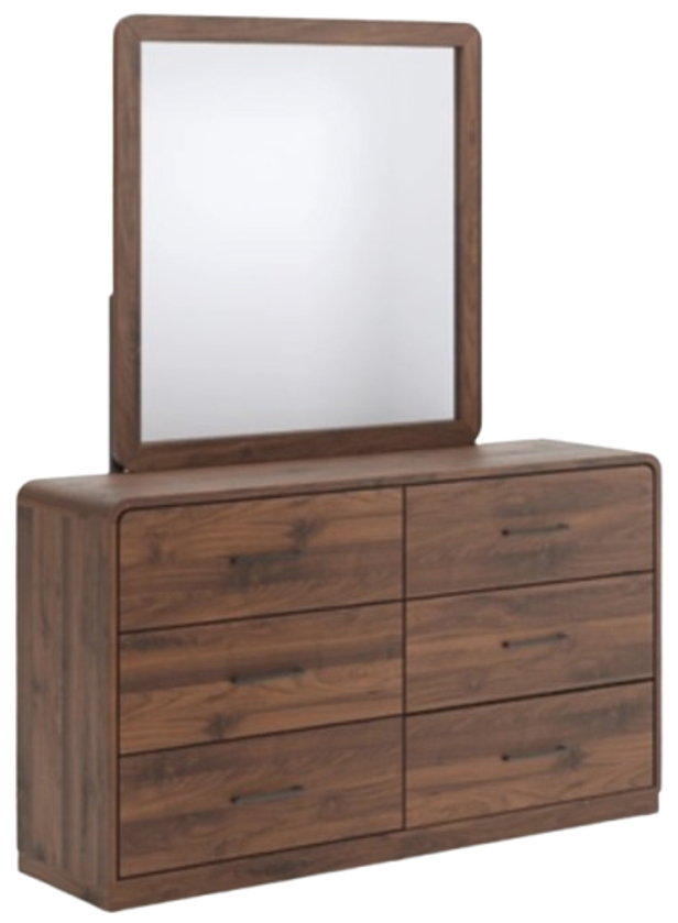 Grace your restful retreat with an added dose of refinement. This dresser with mirror showcases a stunning rich brown wood tone, with sleek drawer pulls for an added layer of luxury. A rounded top and mirror frame soften the silhouette, elevating the look. It’s curated, contemporary and utterly chic.Read More