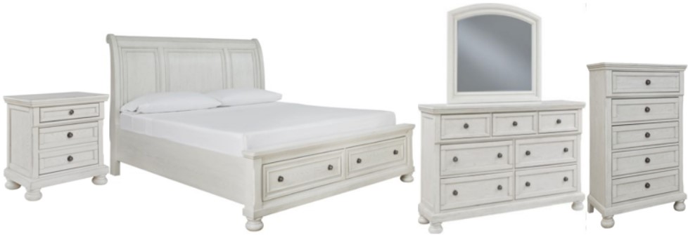 Includes california king sleigh bed with storage (headboard, storage footboard and rails with roll slats), 7-drawer dresser with mirror, 5-drawer chest and 2-drawer nightstand