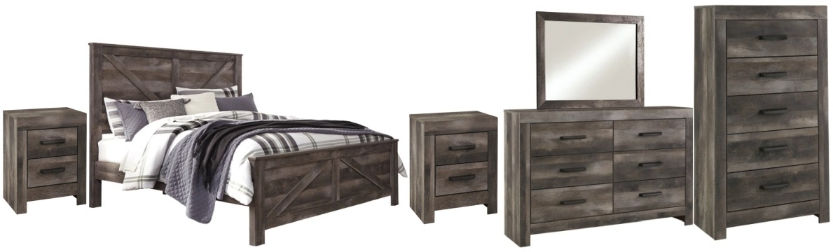 Includes headboard, footboard, rails, mirrored, dresser, 2 nightstands and chest