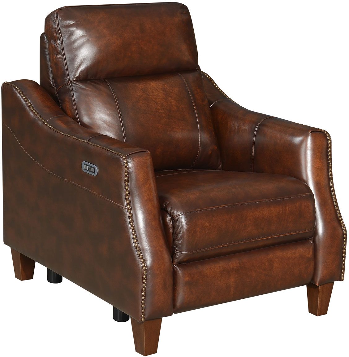 Stylish enough for an old english library yet comfortable enough for the big game, the Akari leather dual power reclining group brings new charm to your favorite recliner. Hand-burnished english chestnut leather appoints all seating areas, accented by nailhead trim.