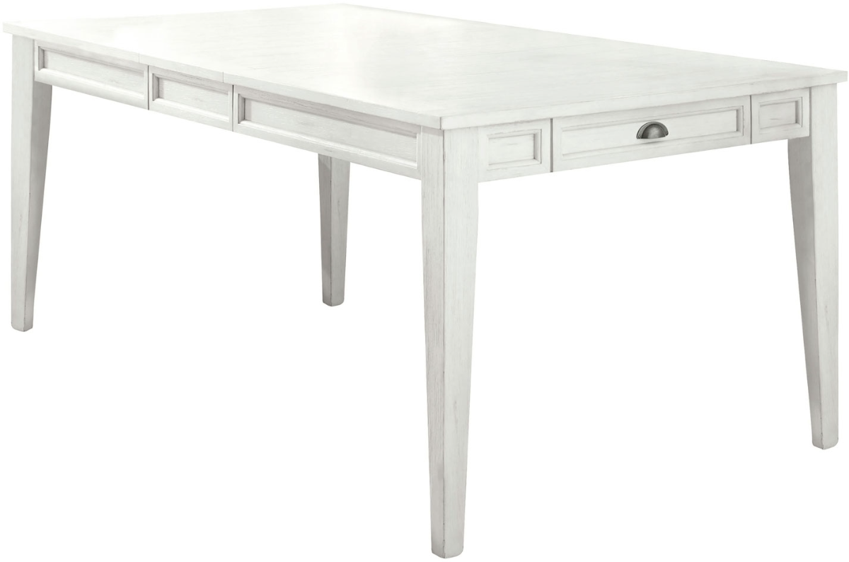 Modern farmhouse styling constructed of hardwood solids with mango veneers in an antiqued white finish