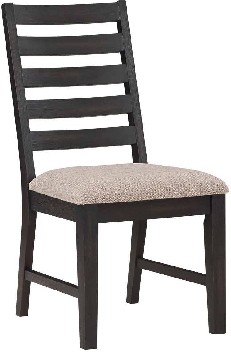 Modern slotback chair with clean lines and upholstered seat can be used with modern or modern farmhouse styles. Solid wood construction and corner blocked joints create a chair built to last with an ebony finish that is neutral, yet bold enough to make a statement.Read More