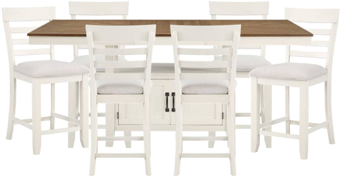 Relaxed, transitional styling in a neutral two-tone milk and honey finish are the hallmarks of the comfortable Hyland Counter Dining Set. A Storage Counter Table anchors any dining area ably with a 20-inch insertable leaf to expand to 80-inches for seating of up to eight.Read More
