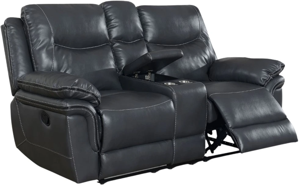 Loveseat features console with cup-holders and storage compartment for remotes and other items