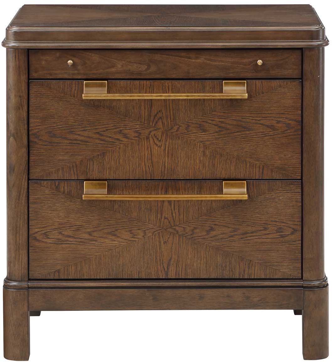 Modern style in a warm brown walnut finish, the Milan Nightstand will make a trusty bedside companion. This piece packs a lot of design in a small footprint with sunburst veneer fronts, a reverse ogee top, and a handy pull-out shelf for glasses or beverage storage.Read More
