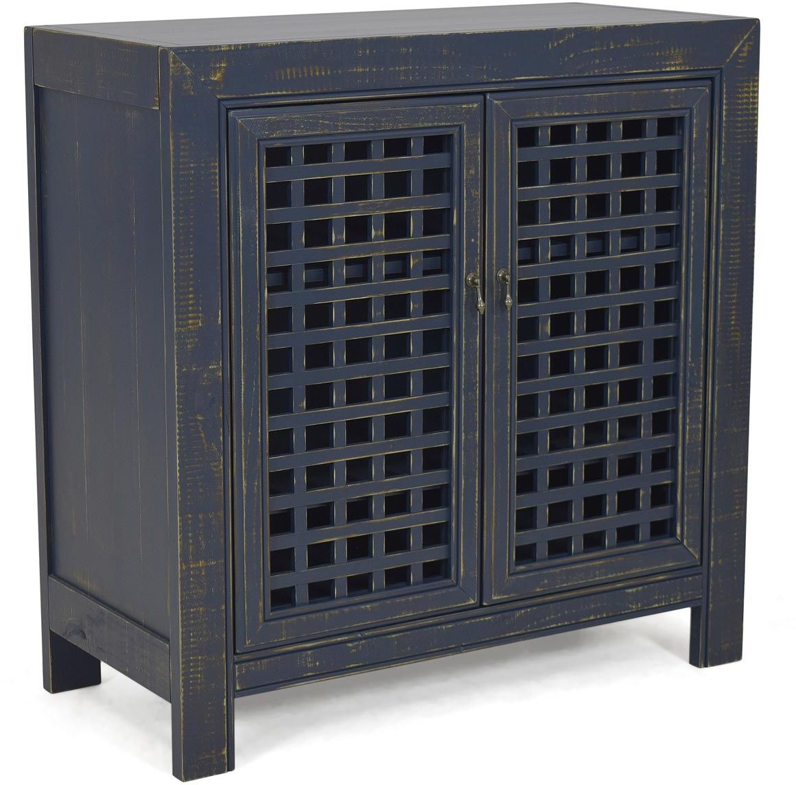 Inspired by the Pie Safes of yesterday, the Rio is designed for today’s rooms with a lattice work front that easily accommodates remotes. This cabinet features a farmhouse style that will beautifully complement casual decors with a distressed, hand-rubbed navy finish that will add a pop to any room.Read More