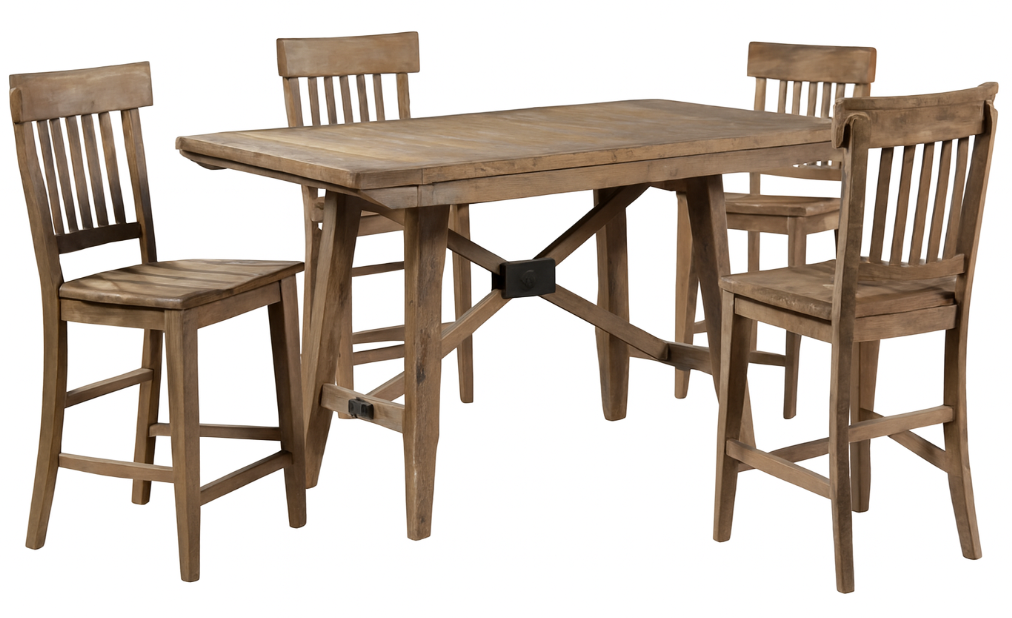 Crafted in a driftwood finish, the Riverdale 5-Piece Counter Dining Set combines durability with refined style. The counter-height table offers a spacious surface, while the matching chairs provide sturdy support and comfortable seating. Built for everyday use, this set delivers both function and a clean, versatile look for dining spaces.Read More