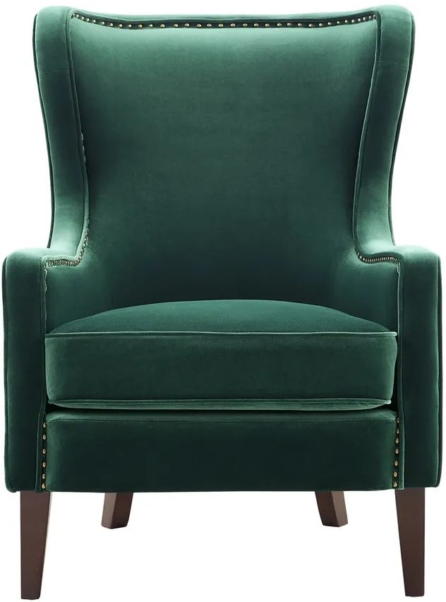 Rosco presents a modern take on classic wing-back chair styling. This silhouette comes in three colors each with a nailhead trim that matches the style of the chair. The emerald green velvet chair shown here features softly curved angles and brass nailhead trim that warms the profile up while lending soft vintage chair.Read More