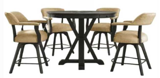 Set includes the Rylie Folding Game Top, the Rylie 48-inch Counter Dining Table and 4 Rylie Counter Captains Chairs. All in black finish with sand vegan leather. Each item also sold separately..