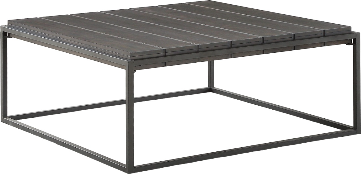 Styling details include large scale cocktail table perfect for sectionals or large area rooms; plank-effect tops with floating top construction; and contemporary iron base